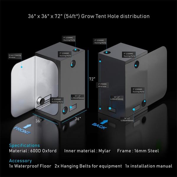 - Itin storas Oxford audinys: pagamintas iš kokybiškos Oxford medžiagos, atsparus įplyšimams. Vidinė dalis iš Mylar medžiagos, kuri padidina apšvietimo efektyvumą auginimo palapinėse. Taip pat pažymėtina, jog palapinės paviršiai yra pagaminti iš aplinkai draugiškų, ne toksiškų, bei neskleidžiančių kvapo medžiagų.